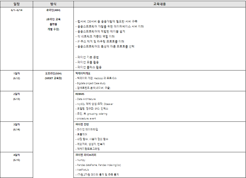 - (오프라인 이론+실습) 6월 12일(월)~6월 23일(금), 50H / WISET 교육장(서울 강남구 테헤란로)